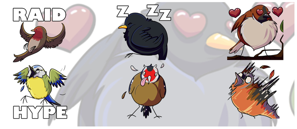 There are 6 packs to choose from: Blackbird, Blue Tit, Chaffing, Gold Finch, House Sparrow, Robin. Each emote pack contains 6 emotes of the bird of your choice! The emotes lineart is identical in each bird pack.